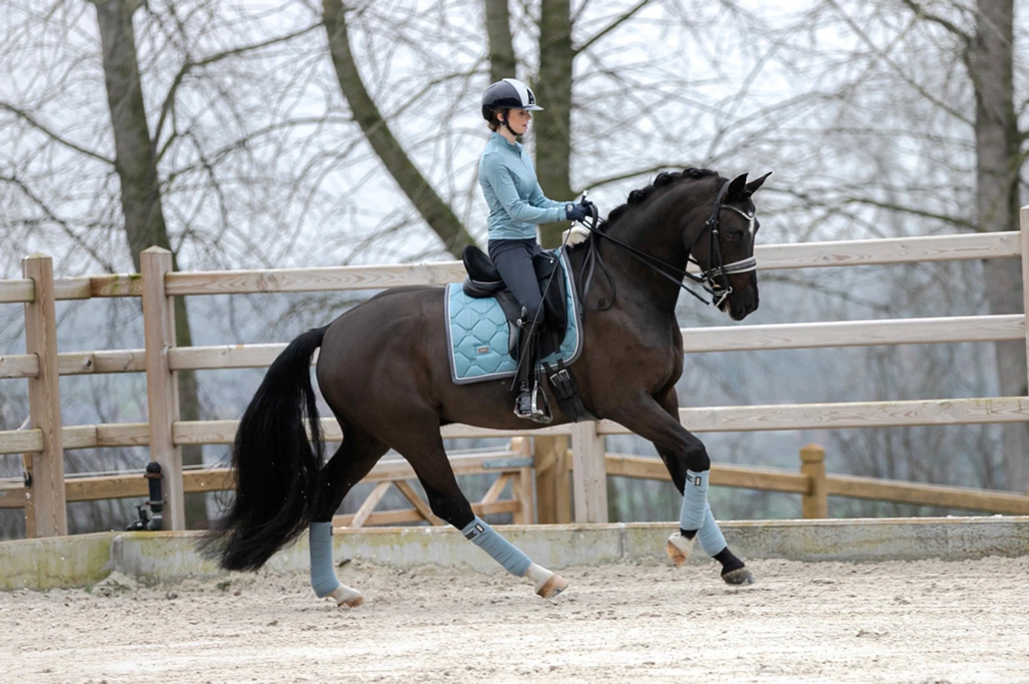 Upgrade your training sessions with this wonderful dressage saddle pad in light blue. Beautiful shiny details in grey and white. Crafted in glossy, dirt-repellent material that breathes well and keeps your horse dry.