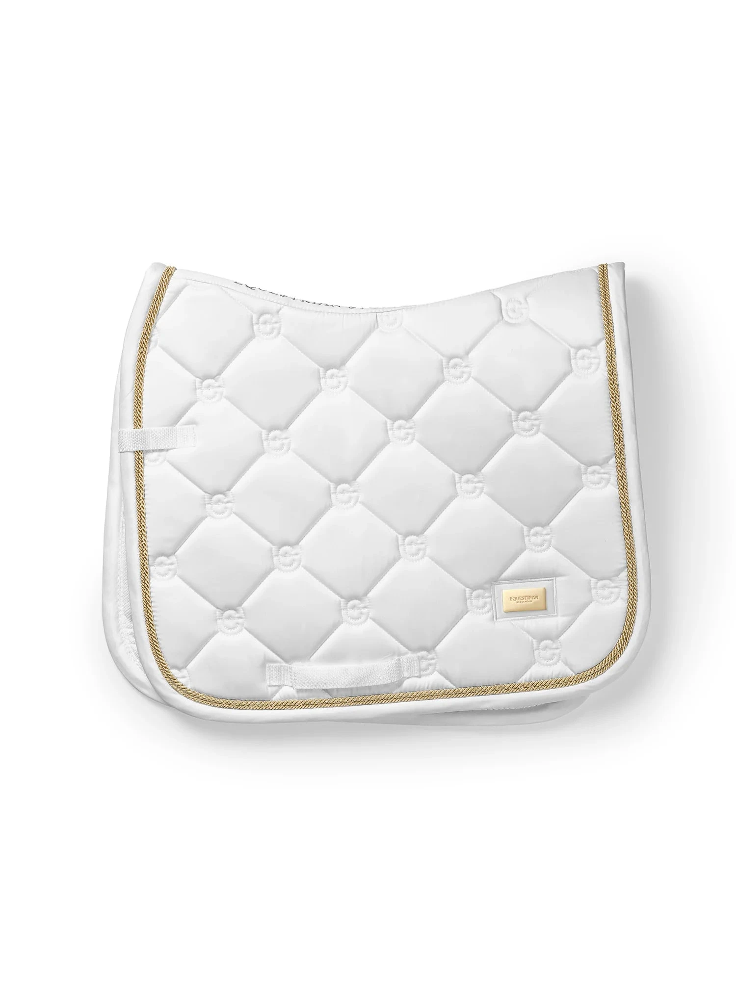 Nice dressage saddle pad in white with gold details and pattern in Equestrian Stockholm’s logo.