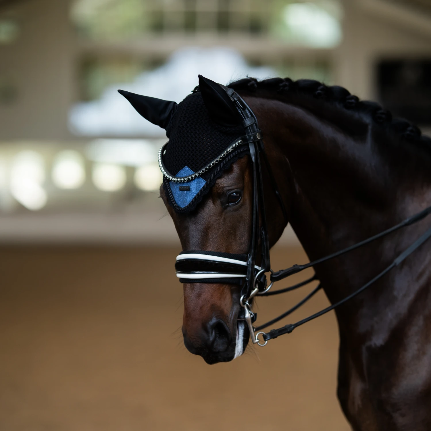 Luxurious crocheted ear bonnet in a stylish black. Decorated with a glittery blue patch on the front, beautiful piping and an Equestrian Stockholm badge in black. The bonnet provides both insect protection and noise reduction. It has elastic fabric on the ears for extra comfort. This ear net matches perfectly with the saddle pad from the Polar Night Glimmer collection.