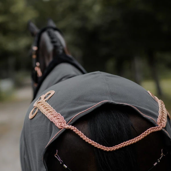 Keep your horse warm with this luxurious dark grey fleece rug. Soft teddy collar in the same beautiful dark grey and stylish details in rose gold. Created in top-quality ECO fleece for minimal climate impact. Reinforced polyester lining under the front for reduced chafing. Buckle in leather imitation. Style with the halter from the same collection for a complete look. The rug comes in a wider size range to fit your pony or horse perfectly.