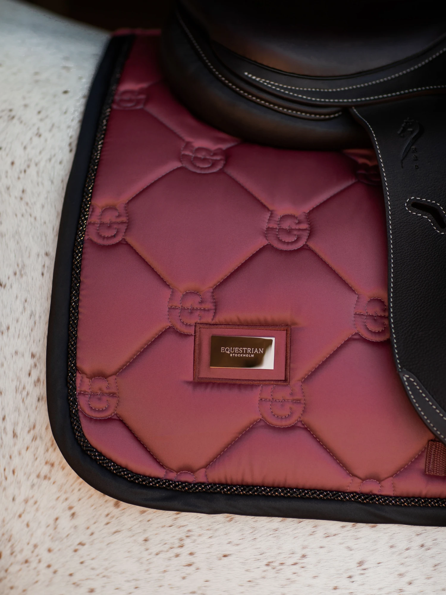 Elegant saddle pad in an soft rouge red colour with black and rose gold details. Decorated with the Equestrian Stockholm badge in copper. The material is treated with High IQ cool comfort which gives the saddle pad quick dry and moisture wicking abilities. This helps your horse stay dry and fresh longer. Style with other pieces from our Soft Rouge collection for a head-to-toe stylish look.