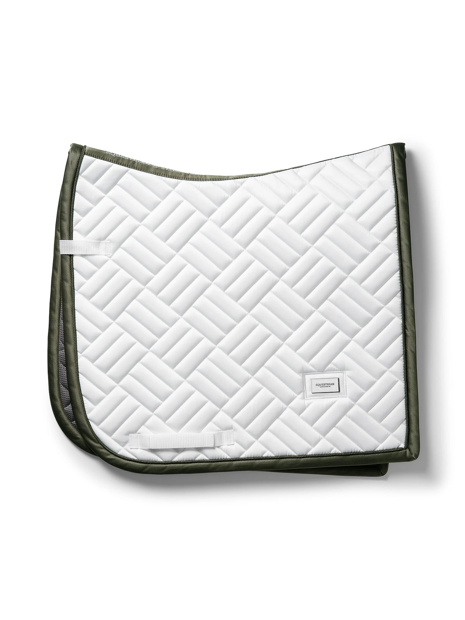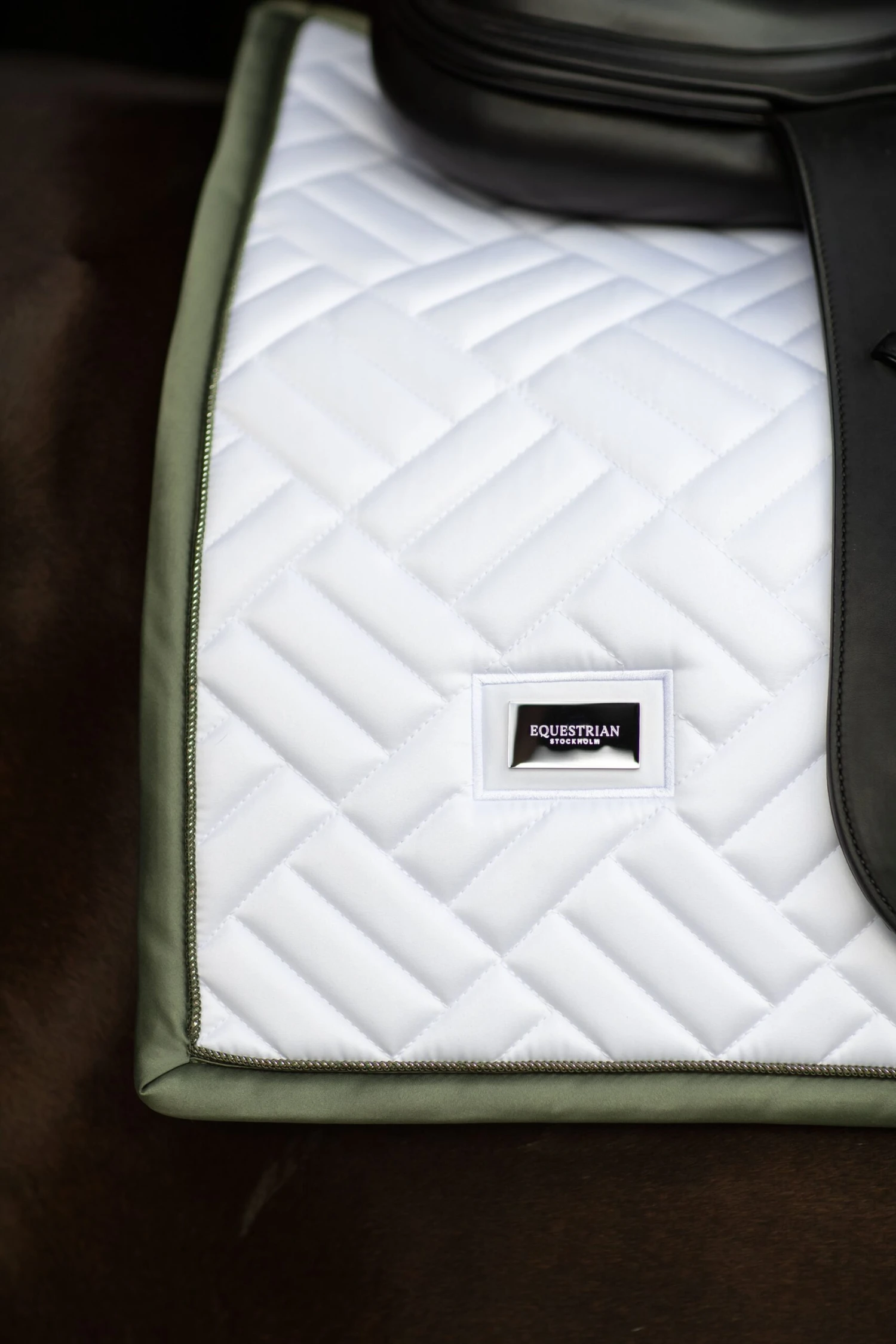 Elegant saddle pad with modern quilting in white with olive green and silver details. Decorated with the Equestrian Stockholm badge in silver. The bamboo material is perfect all year round due to its thermal regulating effect – cooling in the summer and warming in the winter. It is also quick dry, moisture wicking, and anti-bacterial. Style with other pieces from the Striking Valley collection for a head-to-toe stylish look.