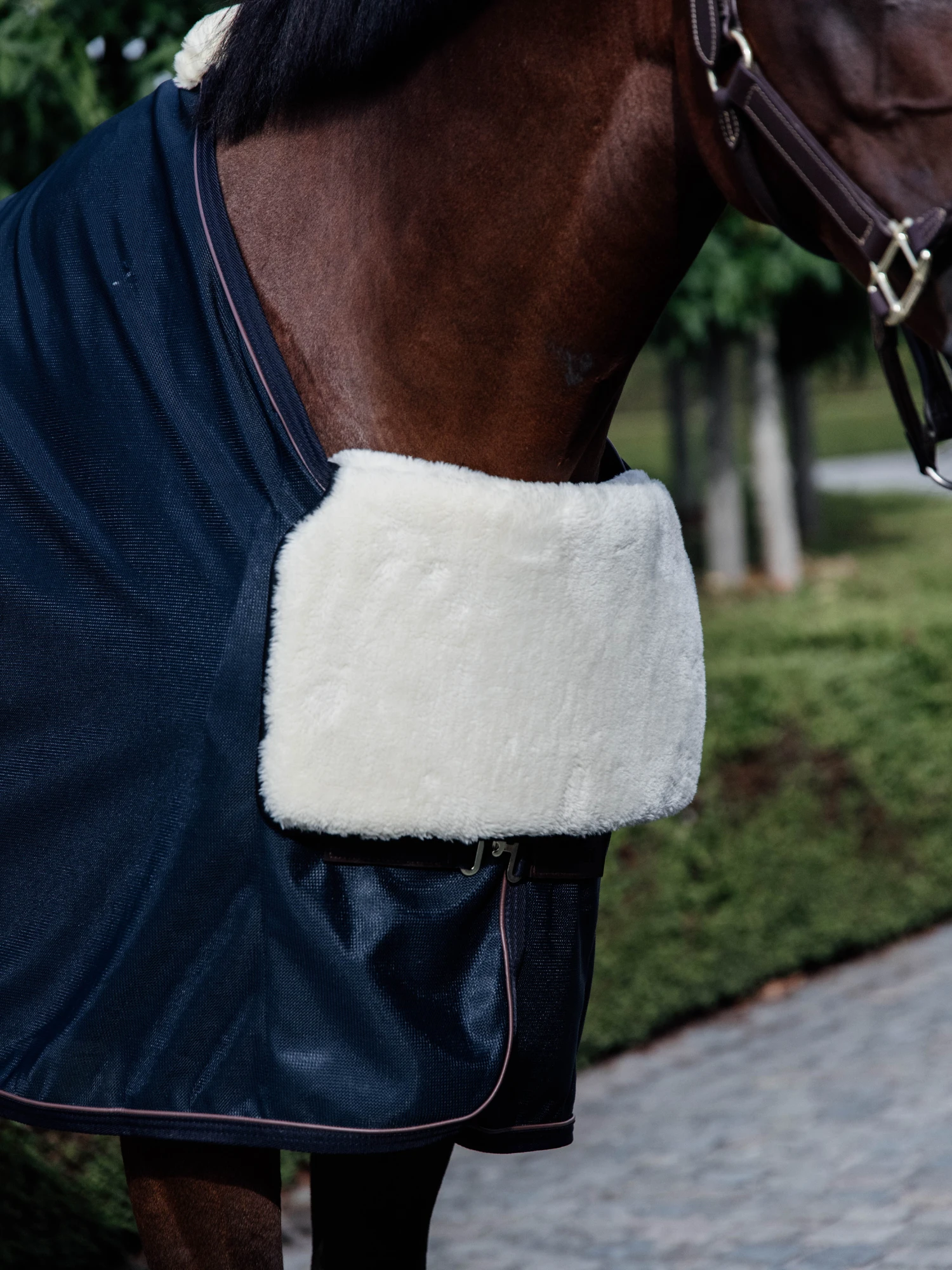 The Horse Bib Chest Protection Sheepskin is ideal to protect your horse from rubbing caused by the rugs. Made in one piece, it will fold in half to come to stand on the front of the blanket. The sheepskin side will be placed against the horse’s chest, which will offer maximum comfort.