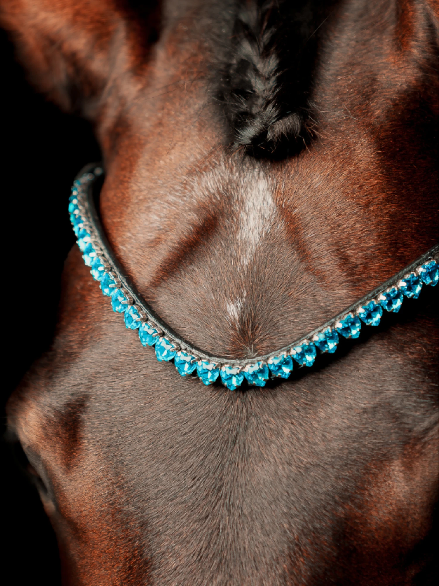 The Je Táime browband is SO adorable with a row of the most beautiful crystal hearts that sparkle in the sun. The browband has our latest closure, so it is easy to change the browband on your bridle. The actual curve on the browband is truly unique and a design we have developed ourselves, so you are sure that the browband curves beautifully down your horse’s forehead.